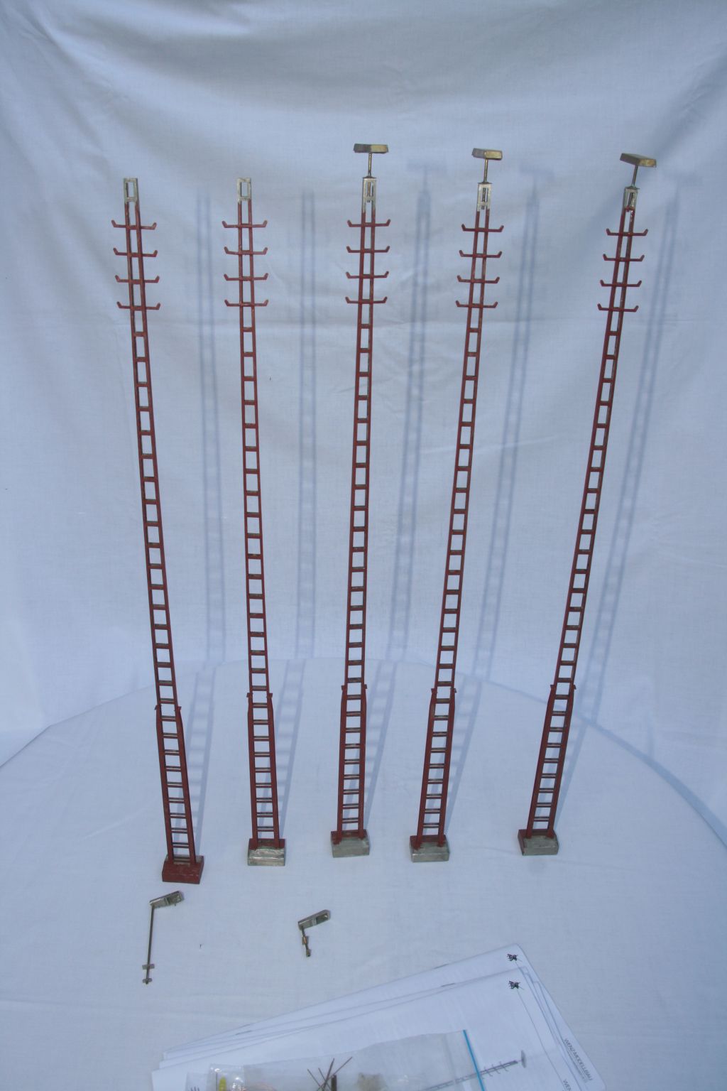 Die zweiflammige Standardleuchte im Bahnhofsvorfeld, in modernen oder modernisierten BW und Rangier- oder Güteranlagen: exakt maßstäbliches Modell einer 13 m Flachmastleuchte der Deutschen Bundesbahn mit Mast Bauart C100 und verstärktem unteren Mastschuß und zweiflammigem Leuchtenkopf. Wartungsfreie LED-Beleuchtung wahlweise in weiß oder gelb. Mast, Sockel und Leuchte filigrane, exakt geätzte Neusilberbauteile, Glas transparentes Frästeil, mit Vierkantmutter M5 zum Einbau in den Sockel für eine stabile und exakte Befestigung der Leuchte. Verschiedene Widerstände zur Helligkeitsanpassung liegen bei, Lötkenntnisse sind erforderlich, Lötwasser empfehlenswert.