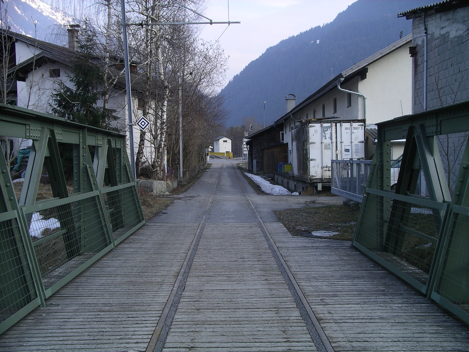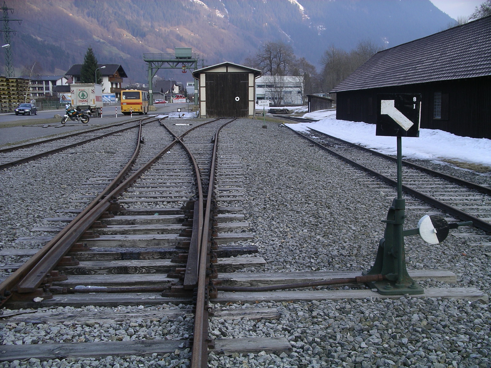 Auf alle Fälle ist mir bei der Fahrt ein Industrieabzweig aufgefallen, den ich einige Tage später dann alleine intensiv anschaute. Zunächst führt von der "Hauptbahn" mit Schutzweiche und Abstellanlage (genageltes Gleis) ein Regelspurgleis über einen größeren Bach (in Kombination mit Fußgänger), dann erste Laderampen, BÜ mit Lichtzeichen, nach 800m endet dies in einem kleinen Rangierterrain mit Entlade, Beladerampen und LS. Am Umladekran beginnt nun ein drittes Gleis (750mm, Industriebahn). Diese Strecke führt wieder zurück mit Abzweig zum LS (steht eine 2-achsige O&K drin)(selbes Gebäude wie oben, nur Rückseite), und 2-gleisig zu einem Güterschuppen. Das Terrain gehört den Illwerken (so heisst der lokale Fluss). Hier einige Fotos Zustand 2/2005.